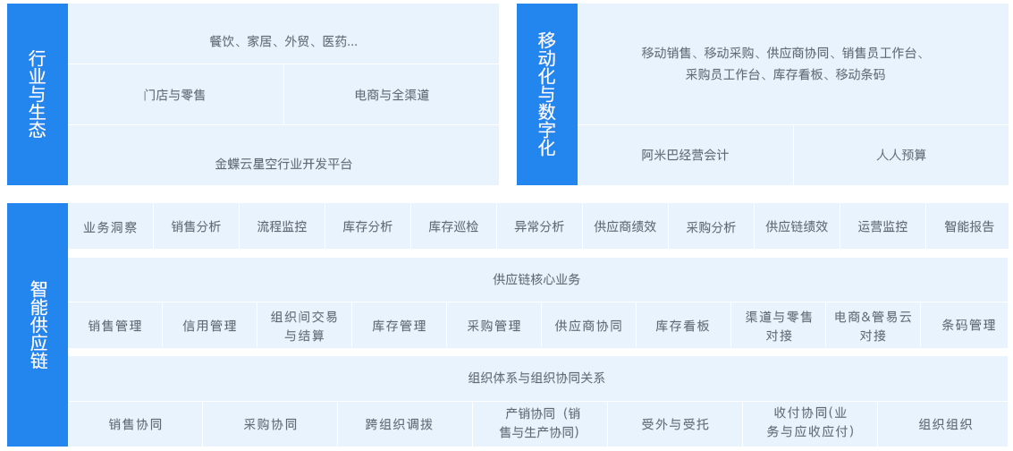 连接协同 基于协同供应链管理思想,致力于推动企业供应链数字化转型,帮助企业快速建立自己的全球供应链体系,通过连接营销端的客户、经销商、终端消费者、上游的供应伙伴,将企业上下游的伙伴互联互通,实现产业链业务协同,构建高效的上下游业务协同产业链 智能柔性 基于云计算、大数据等的运用为企业构建网络化共享,实现供应链各个环节的智能化协作,满足个性化订单、库存、销售预测之间的平衡,使整个供应链更具灵活性和敏捷性。