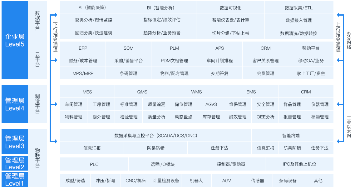 通过工业网络,纵向打通企业层、管理层、操作层、控制层设备层数据链路,实现数据的双向互通,实时共享。下层物联平台,实现设备联网,实时采集生产设备、物料数据数据;中层智造平台实现生产过程各环节及要素的精细化管控;上层云平台、数据平台实现资源管控和共享服务,基于数据持续精益改善。